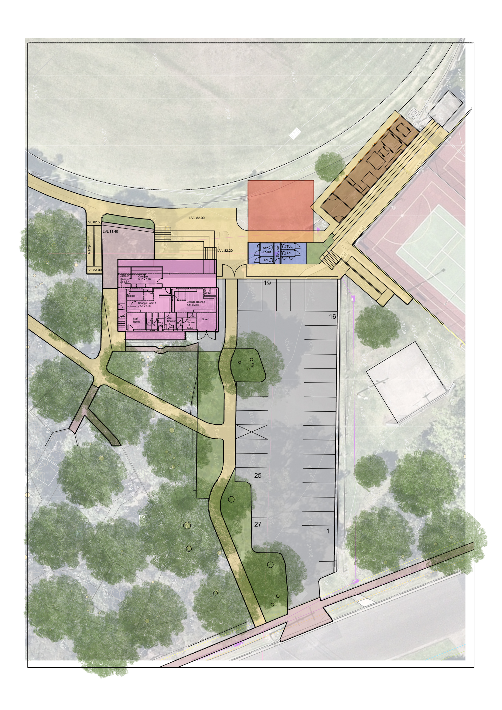 The existing amenities ground floor is getting a glow-up. Larger space, brand new feel. Public toilets and storage are moving to their own separate buildings.